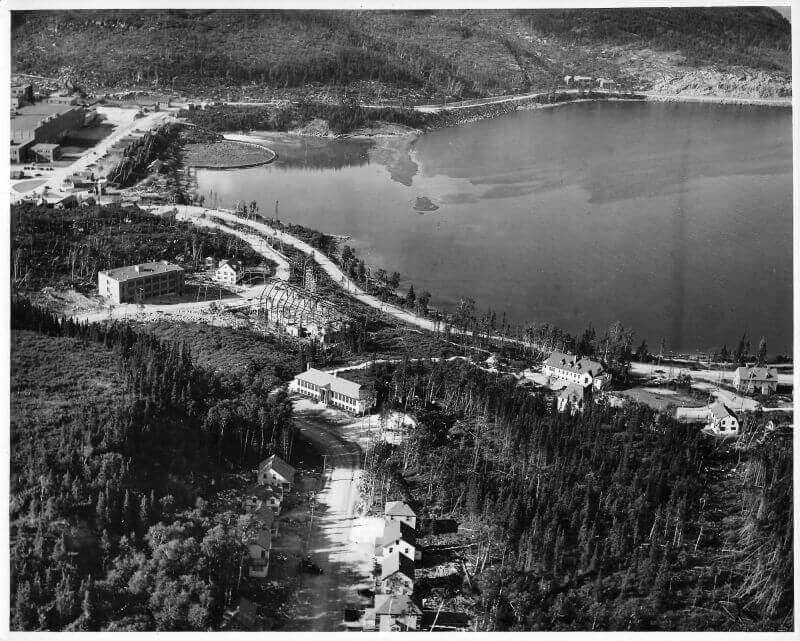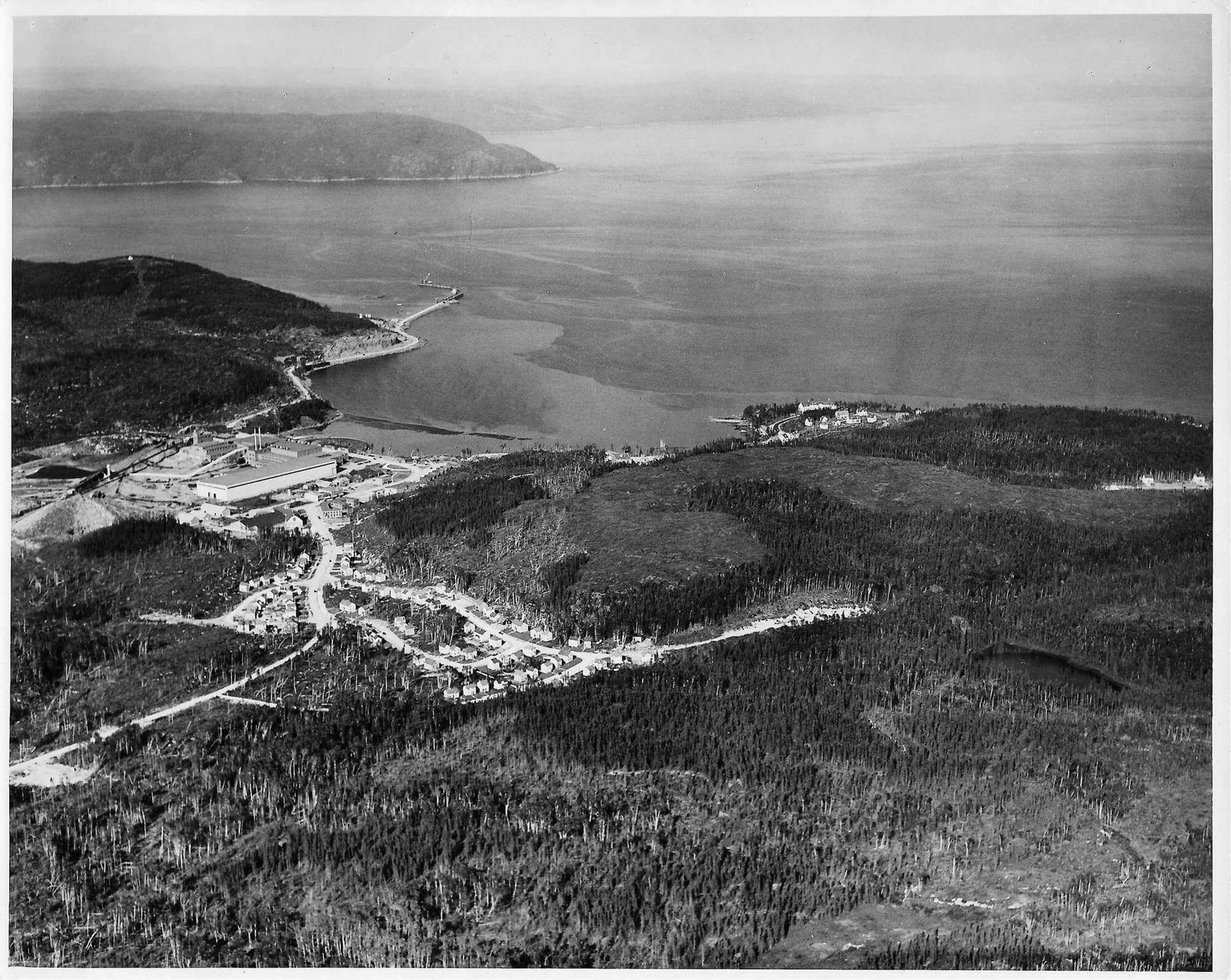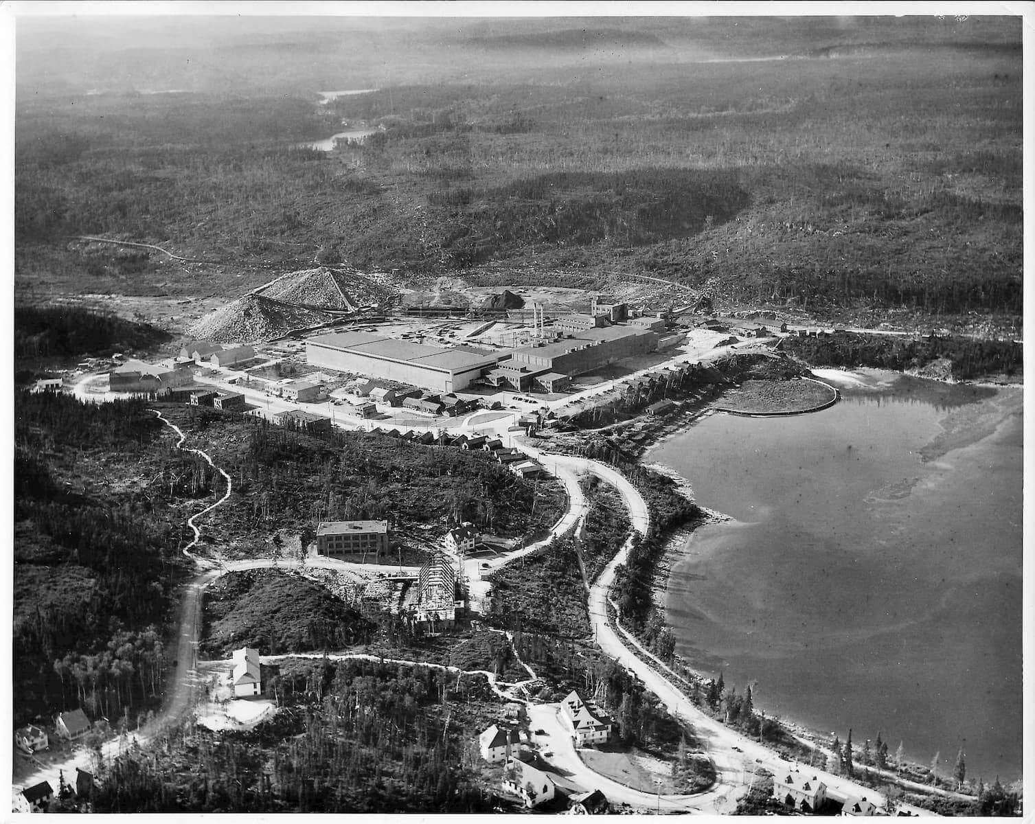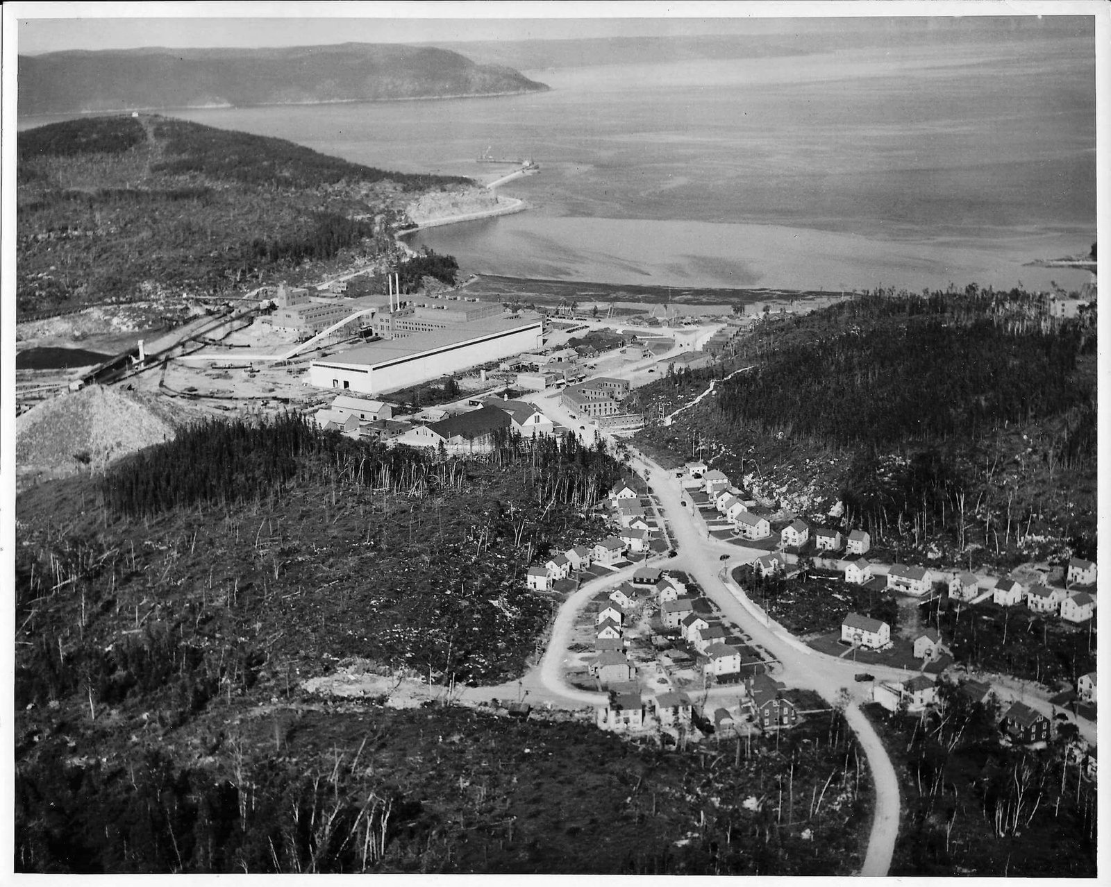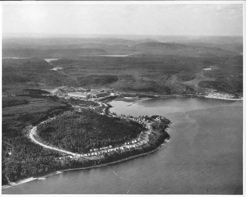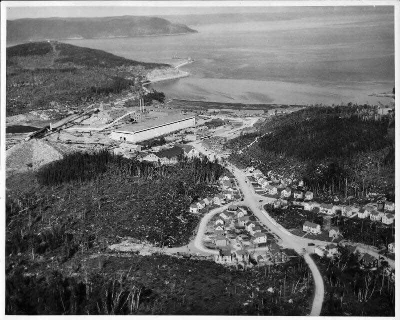 Le 12 avril 1936, le navire Jean-Brillant apporte les cadres et les ingénieurs de la compagnie dans l'anse à Comeau. Le lendemain, le navire Marco-Polo arrive de Rimouski avec les premiers ouvriers et le ravitaillement. La construction débute par les camps des travailleurs, l'amélioration du quai ainsi que la route et le chemin de fer reliant le quai à l'emplacement de l'usine. Le chantier est strictement réservé aux travailleurs. Dû à la situation de pénurie d'emploi, les travailleurs attendent sur le quai de Rimouski pour tenter de se faire embaucher. Il y a environ 1500 travailleurs présents sur le chantier la première année. Dès juin, deux commerces, un barbier et une cordonnerie, ouvrent directement dans les baraques. Au début août, la construction du quai et du chemin de fer est complétée. Le premier bâtiment de la nouvelle usine de papier à être construit est l'atelier mécanique, ensuite la remise à papier, les bureaux, les magasins et la salle de finition. À l'automne, vingt-six résidences privées sont complétées ainsi que le premier manoir Comeau, les rues Champlain et Cartier sont alors créées. Environ 500 travailleurs sont affectés à la construction de la centrale électrique de 75 MW du barrage sur la rivière Outardes et de la ligne de transmission. Le département des opérations forestières, responsable du défrichement et de la planification de la ville, construit un arboriduc entre le lac Comeau et la ville, afin de transporter le bois pour alimenter l'usine.
